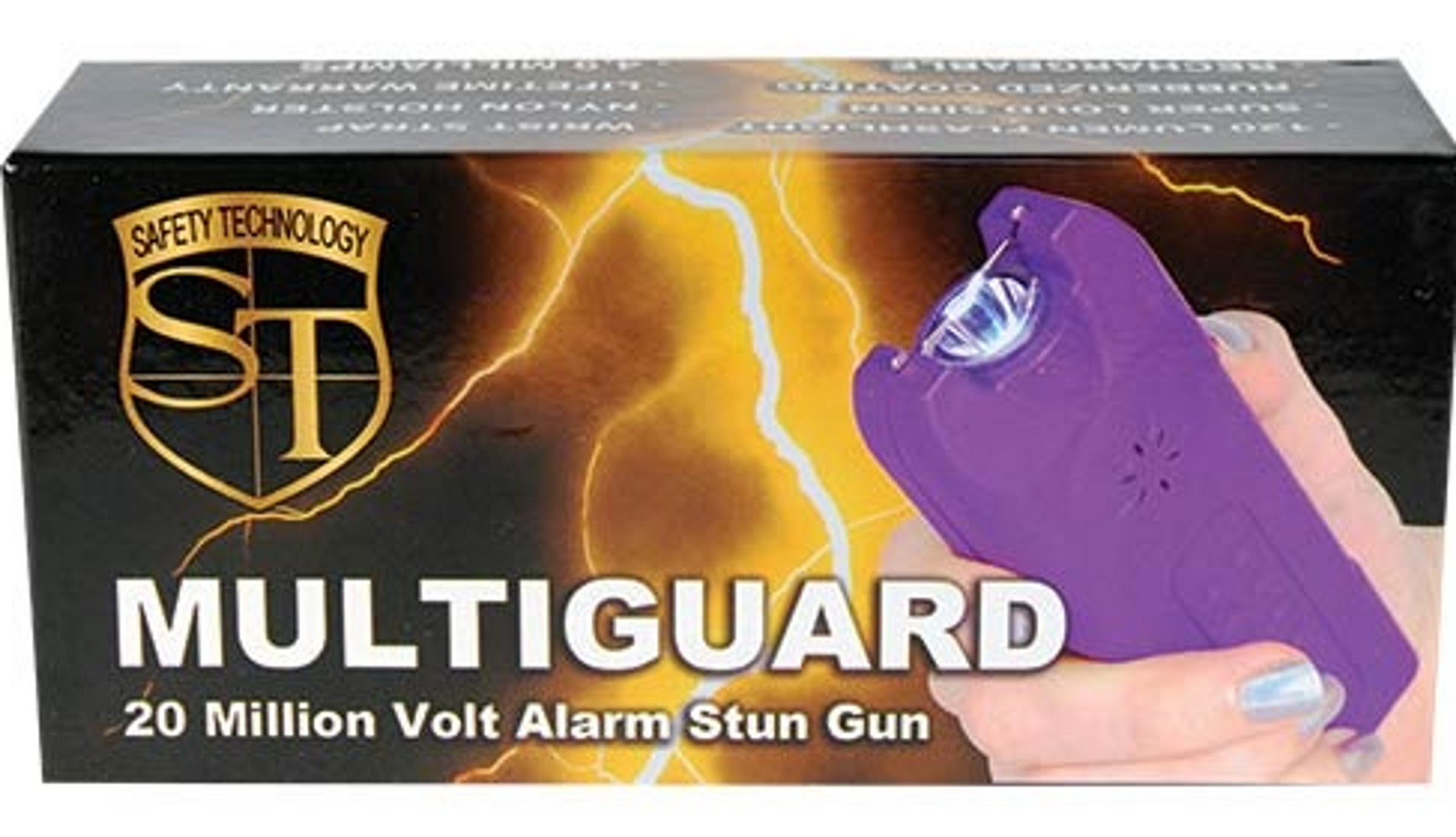 Stand your ground with the MultiGuard Easily concealable and virtually undetectable in hand, the MultiGuard delivers super powered protection with cutting edge micro-technology. Featuring a super-loud siren to draw attention, you may defuse a dangerous situation before it begins! It has a blinding 120 Lumens LED flashlight and a rubberized coating for a better grip. Electrifying stun feature operates with flashlight or siren on. You can carry the MultiGuard in your hand or pocket. Built in charger and heavy duty nylon belt loop holster included. Specifications: o 4.9 milliamps depending on the freshness of the batteries o 80,000,000 volts o Measurers 5 1/4 " x 1 3/4 " x 7/8" o Rechargeable built in charging prongs plug right into a wall socket Features: o Nylon Belt Loop Holster o Rubberized Coating o 120 Db Siren o Built-in LED Flashlight o LIFETIME WARRANTY o Available in 7 colors Black, Pink, Red, Purple, Green, Blue, and Zebra